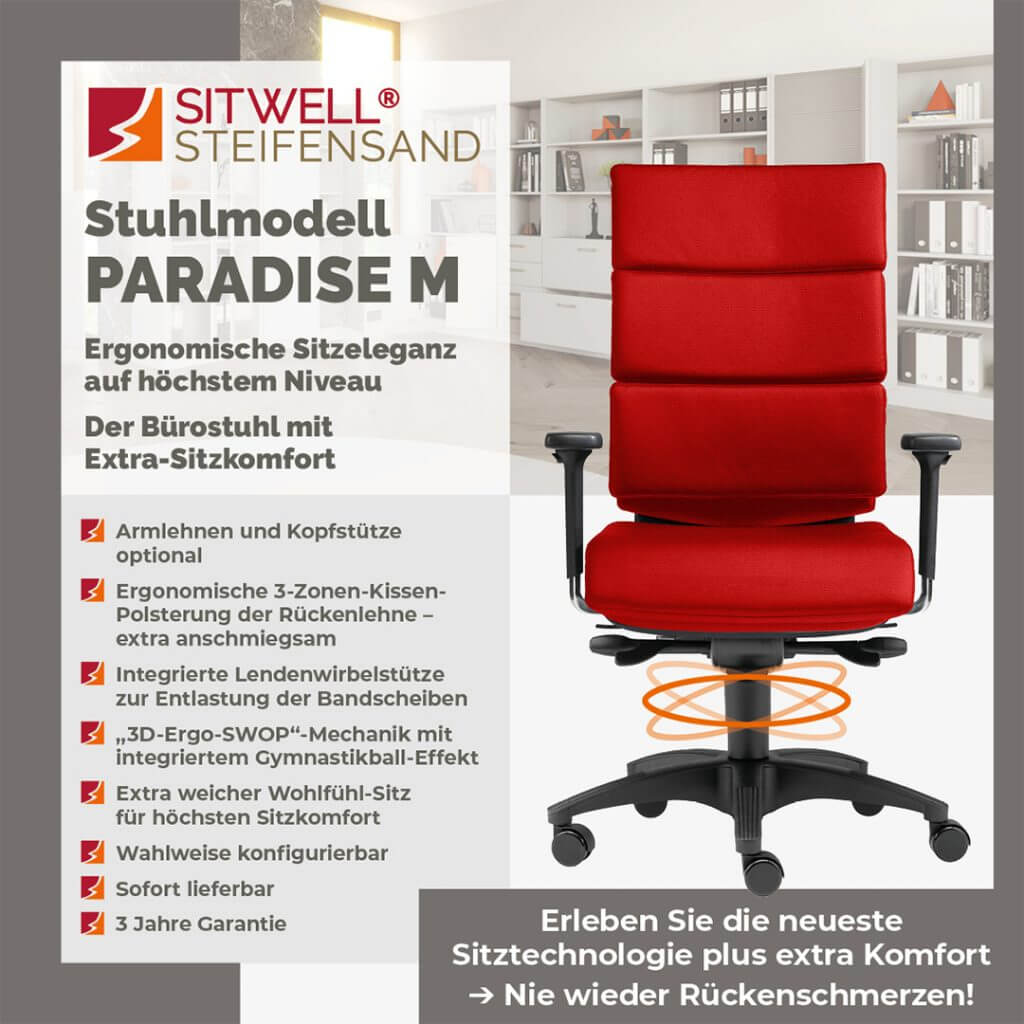 Seit über drei Jahrzehnten widmet sich die SITWELL® STEIFENSAND AG der Entwicklung erstklassiger ergonomischer Sitzlösungen, die Funktionalität mit ansprechendem Design und Beständigkeit vereinen. Ein besonderes Merkmal unserer Premium-Modelle ist die Verwendung exzellenter Werkstoffe – angefangen bei edlem Echtleder bis hin zu luftdurchlässigen Textilien –, wodurch wir höchste Qualität direkt aus Deutschland garantieren.
